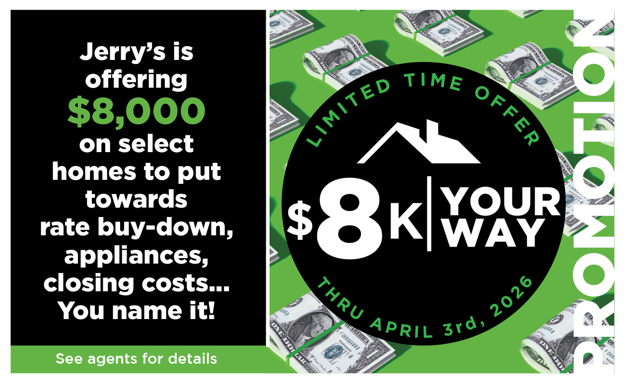 *Eligible to those who have a mutually agreed-to offer signed by 5:00pm on April 3, 2026. Agreements can not have contingencies to qualify for the promotion. Money to be used with Jerry’s Homes’ preferred partners. Some restrictions may apply. Jerry's Homes will not exchange cash in lieu of prizes. Must close within 60 days of contract date. Information subject to change. See agent for details.